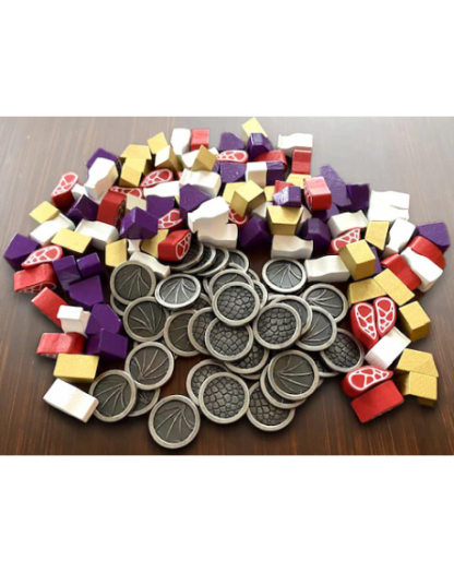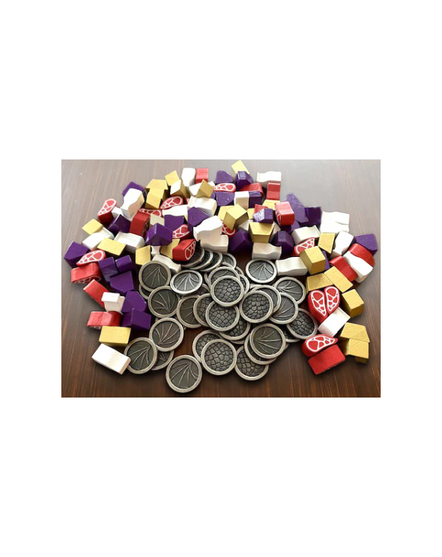 Kit de recursos Deluxe oficiales para Wyrmspan que contiene 45 monedas metálicas y 104 recursos de madera (26 unidades de cada uno de los siguientes: carne, gemas, oro y leche) diseñados específicamente para este juego.