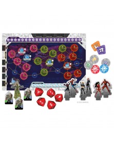 1 cuaderno de reglas, 1 guía de héroes, 1 tablero de juego, 10 hojas de héroe de doble cara, 20 peones de héroe, 6 peanas de aspecto, 6 hojas de aspecto, 4 hojas de supervillano, 4 peones de supervillano, 1 peana de supervillano, 60 peones de enemigo, 28 cartas de enemigo, 10 cartas de asistencia, 40 cartas de recurso, 42 cartas de evento, 58 cartas de misión, 5 cartas de referencia, 1 ficha de aturdimiento, 30 fichas de aspecto, 20 fichas de combo, 44 fichas de progresión, 41 fichas de daño, 1 ficha de La Ilíada, 1 ficha del Bifrost, 5 fichas de invasión, 3 fichas de contención, 5 fichas de misión, 5 dados de héroe, 13 peanas de plástico, 1 ficha de jugador inicial, 1 indicador de amenaza, 1 indicador de umbral de amenaza, 1 indicador de asistencia.