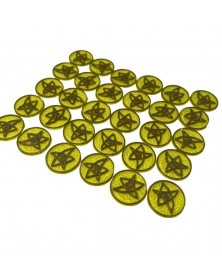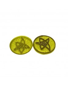 Monedas Arcanas impresas 3D en PLA de dos colores: amarillo traslucido y detalles en dorado antiguo.