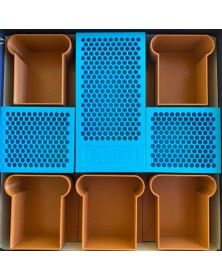 Inserto de impresión 3D en dos colores con el que puedes guardar todos los componentes del juego Pradera incluyendo el contenido de la expansión Río Abajo.